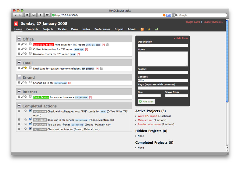 Tracks is a web-based application to help you implement David Allen’s Getting Things Done™ methodology. It was built using Ruby on Rails, and comes with a built-in webserver (WEBrick), so that you can run it on your own computer if you like. It can be run on any platform on which Ruby can be installed, including Mac OS X, Windows XP and Linux. Tracks is Open Source, free and licensed under the GNU GPL.